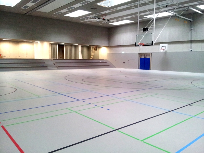 Der Neubau der 3-fach Sporthalle in Olching war eine besondere Herausforderung für alle Beteiligten. Eine optimale Verbindung zwischen Architektur, Akustik und Brandschutz zu erzielen, stellte sich als besonders umfangreich heraus. Zum Einsatz kam das System Flex A2 100-1000var mit einer Unterkonstruktion aus Stahlprofilrohren, sowie einer Verkleidung aus Buche B1 Sperrholzplatten. Für eine optimale Akustik sorgt die vorderseitige Schlitzung, verbunden mit einer rückseitigen Lochung der Prallwandverkleidung.