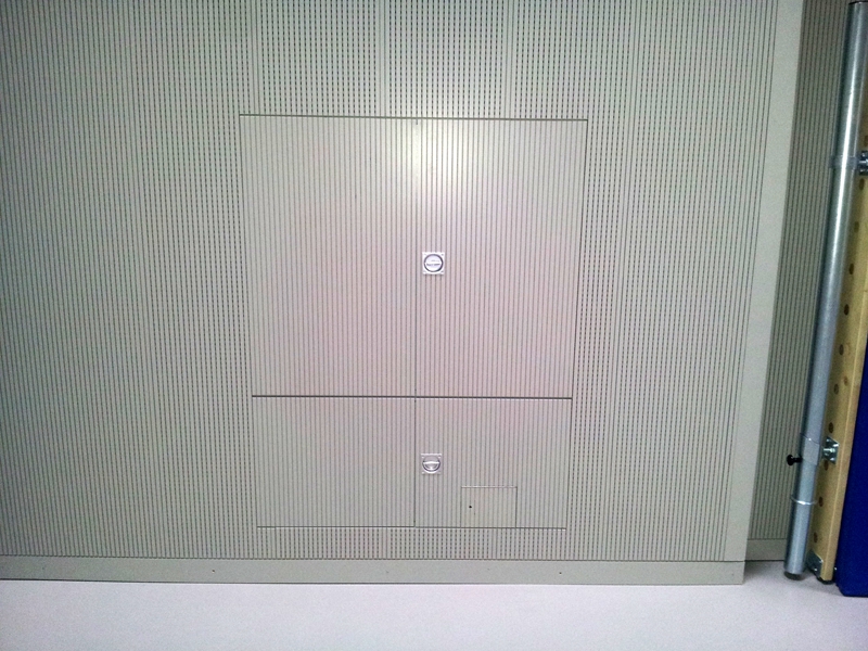 Im Detail wurden alle Türen, Tore, Klappen und Seiltaschen auf das Schlitzraster einjustiert, sodass keine Lamellen angeschnitten werden mussten. Auf Wunsch des Architekten wurden die geschlitzten Wandpaneele abschließend nach RAL 7044 ringfest und feuerhemmend lackiert. |